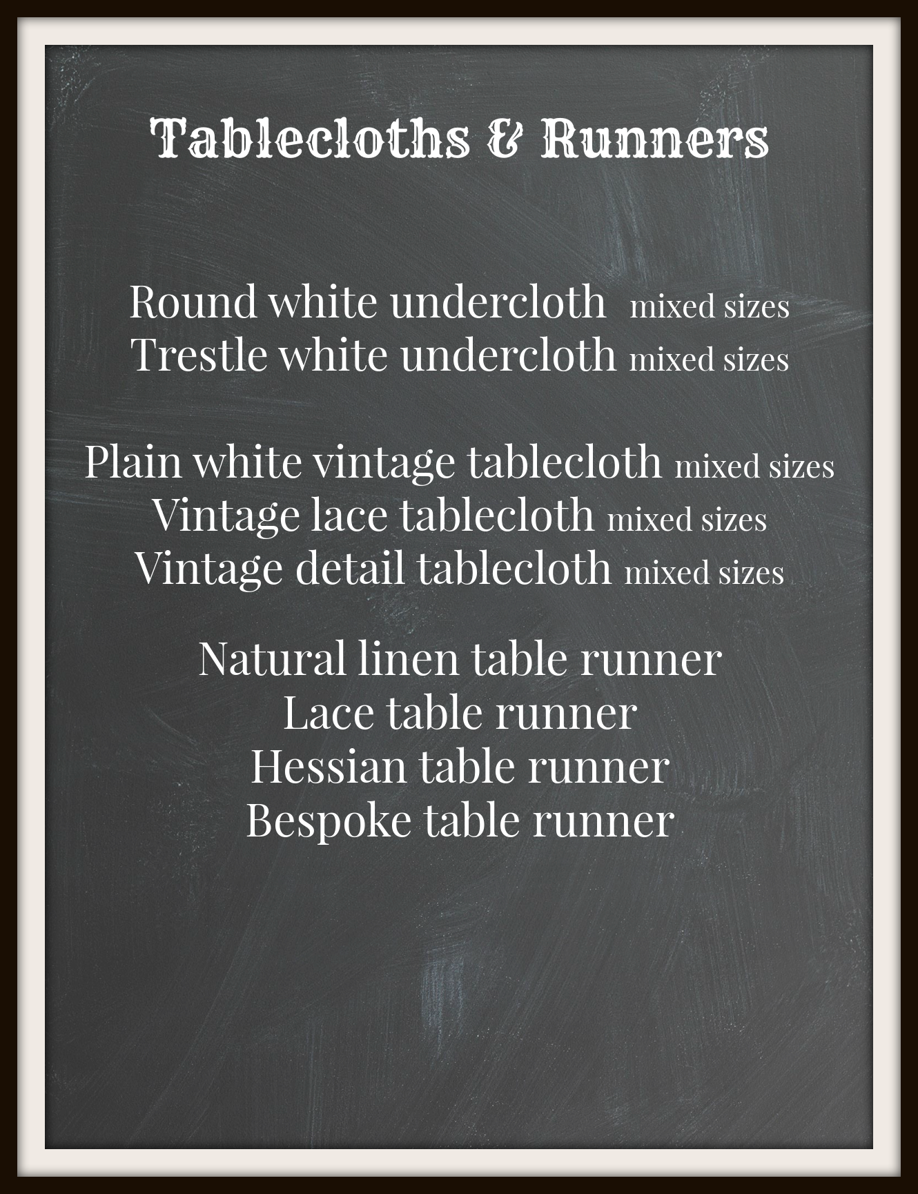 Our tablerunners look beautiful on both long tables and smaller rounds and offer a soft contrast on bare wood tables. Choose from rustic hessian, natural linen or pretty tumbling lace. We can also make tablerunners bespoke to your tables.